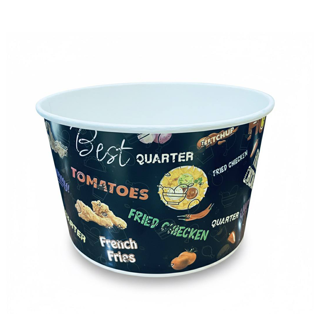 سطل سوخاری سایز ۲۰۰۰ کاملاً بدون بو، سازگار با استانداردهای تماس با مواد غذایی و قابل استفاده برای غذاهای داغ است. سطح صاف و یکدست آن، امکان چاپ باکیفیت لوگو و طرح اختصاصی برند را فراهم می‌سازد و آن را به ابزاری مؤثر برای تبلیغ و برندینگ کسب‌وکار شما تبدیل می‌کند.